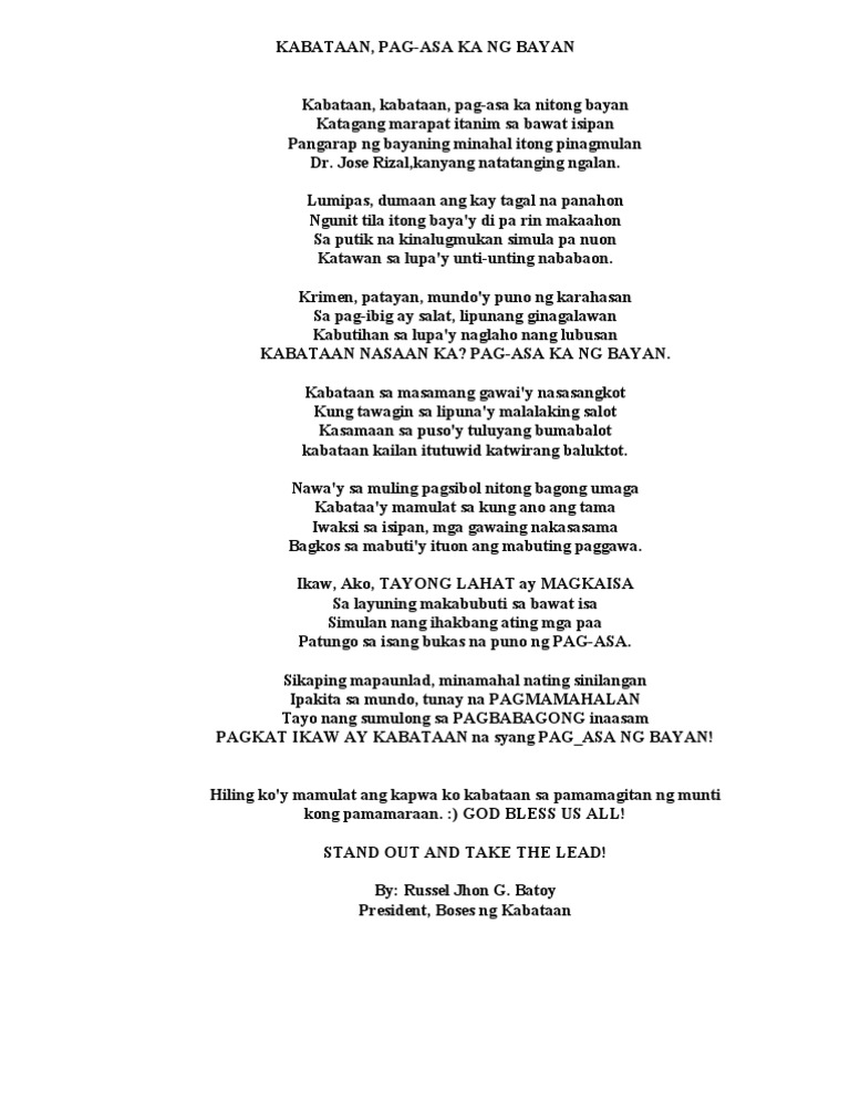 Kabataan ang pag asa ng bayan sanaysay. Bilang Kabataang Pilipino malaki ang ating maitutulong sa ating bayan para. Naniniwala ko na ang kabataan ng pag asa ng bayn ayon ng aky gat jose protacio rizal mercado y alonza realonda na ang kabataan ang pag asa na bayan at isa na ako sa kabataang pag asa ng bayan na kaming mga kabataan ay gagawin ang magagandang nasimulan ng ating bayani kaya kami ay andito sa paaralan upang mag aral ng mabuti at gawin ang aming. Sa kanya sa putik ng kahirapan at kahihiyan.