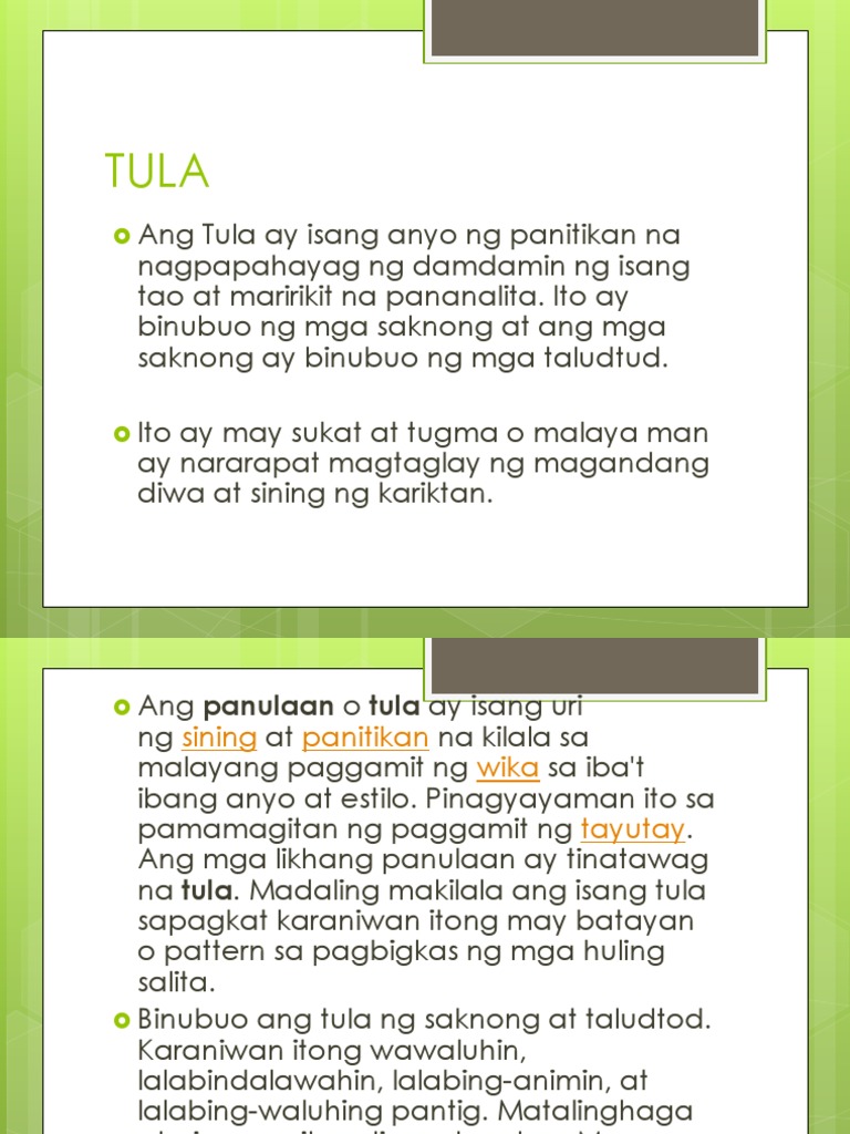 Ang Tula is isang anyo ng sining o panitikan na naglalayong maipahayag ang damdamin sa malayang pagsusulatBinubuo ang tula ng saknong at taludtodAng tula ay maaaring distinggihin sa tatlo na bahagi. Ang mitolohiya ay tumutukoy ito sa kalipunan ng mga mito mula sa isang pangkat ng tao sa isang lugar na naglalahad ng kasaysayan ng mga diyos-diyosan. TULA TAGALOG Ang tula ay isang uri ng sining o panitikan na nag papahay ng damdamin o emosyon ng isang tao.